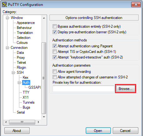 Puis rendez-vous dans « SSH » > « Auth et charger la clé précédemment enregistrée en cliquant sur browse