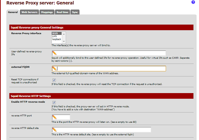 Dans l’onglet général il faut définir l’interface réseau sur lequel le reverse proxy sera actif, selectionnez l’interface wan et activer le reserve en cochant la case « Enable HTTP reverse mode »